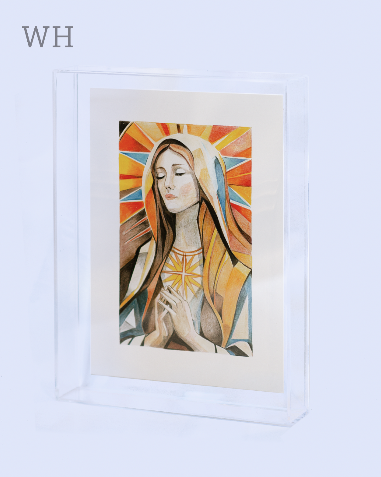 Quadro decorativo com Virgem Maria em lápis de cor. Em moldura acrília de 3mm.